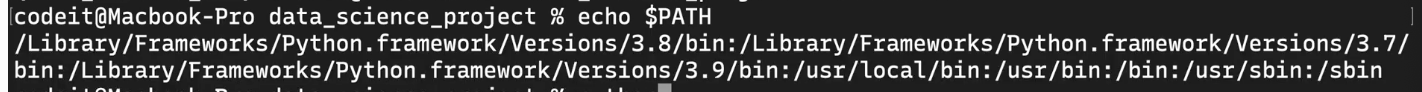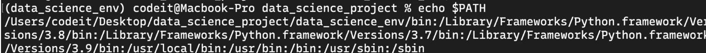 activate 파일은 환경 디렉토리 안에 bin 디렉토리 안에 있습니다. 소스 커맨드는 특정 파일을 현재 터미널 안에서 실행시켜주는 커맨드입니다. 데이터 사이언스 env 환경안에 있는 activate를 파일을 실행시키는 것입니다. 이 때 가상환경이 적용됩니다.