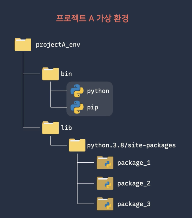 한 컴퓨터나 시스템에서 프로젝트 단위로 고립시켜서 사용하는 것을 가상 환경입니다. 작동하는 원리는 글로벌 환경과 똑같습니다. 프로젝트마다 인터프리터를 만들고, pip과 site-packages를 만듭니다.