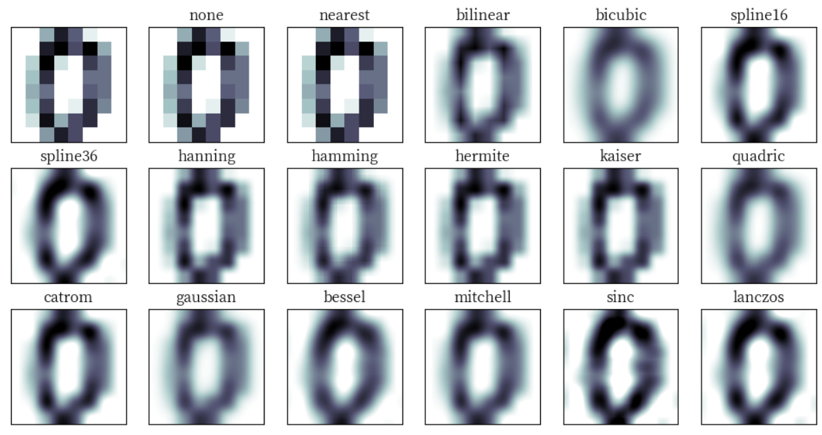 imshow 명령은 자료의 시각화를 돕기위해 다양한 2차원 인터폴레이션을 지원합니다.