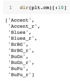 사용할 수 있는 칼라맵은 plt.cm의 속성으로 포함되어 있습니다. 아래에 일부 칼라맵을 표시하였습니다.