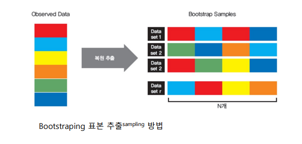 부트 스트랩 분할 방식 : 원본 학습 데이터에서 데이터를 샘플링해서 추출하는 방식, 중복을 허용(복원 추출)