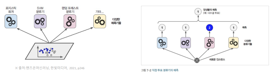 예측을 통해서 모델 4개가 예측치를 1, 1, 2, 1로 뽑았다면 다수결의 원칙으로 1을 예측 결과로 반환