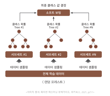 최종 예측을 하 는 점은 voting과 동일 ⎼ 학습할 데이터를 추출하는 방식에서 차이: 부트스트랩(bootstrap)이란 표본 추출 방법(복원 추출)을 이용해 각 모형의 다양성을높여 앙상블 하는 방법 ⎼ 같은 종류의 알고리즘 모델을 여러 개 결합하여 예측 ⎼ 각각의 모델에 전체 학습 데이터 중 서로 다른 데이터를 샘플링하여 학습하는 점이 보팅과 차이 ⎼ 앙상블 모형으로 주로 결정트리 모형이 많이 쓰임. ⎼ sklearn.ensemble.BaggingClassifier