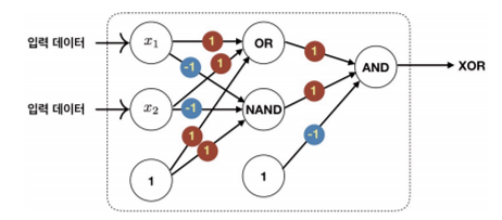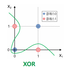 - 배타적 논리합(EXCLUSIVE OR) XOR 연산은 선형으로 분리할 수 없기 때문에 수행이 불가능하다.