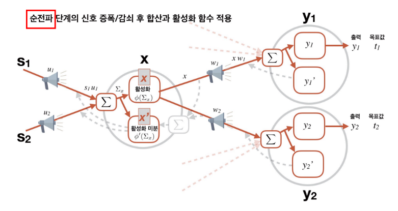 역전파 알고리즘을 이용한 연결강도 갱신 학습법을 이해하기 위해 아래와 같이 순전파 경로와 역전파 경로를 모두 표시한 연결망