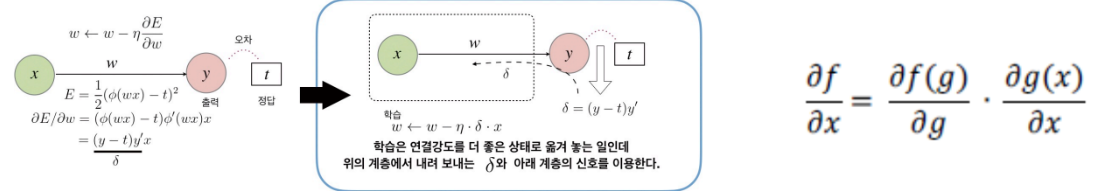 - 학습 과정은 연결강도를 수정하는 것이기 때문에, 출력단의 오차가 역방향으로 활성화 함수의 미분함수를 거친뒤에 연결강도에 의해 증폭되어 입력단까지 전달되는 과정으로, 이러한 신경망 학습 방법을 오차 역전파 알고리즘이라함