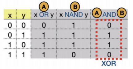 - 이 진리표를 살펴보면 X OR Y의 결과가 0, 1, 1, 1이며 XNAND y의 결과가 1, 1, 1, 0이므로 이 두 출력의 AND가 0, 1, 1, 0으로 XOR 임을 알 수 있다.