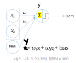 - x와 가중치 w를 곱한 값을 모두 더하여 하나의 값(y)로 만들어냄