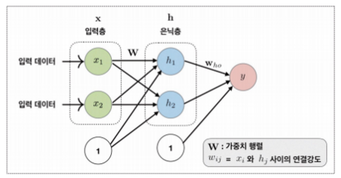 - 가중치는 입력층에 있는 n개의 노드가 발생하는 신호를 은닉층에 있는 m개의 노드로 연결하는 가중치 행렬 W에 의해 전달
