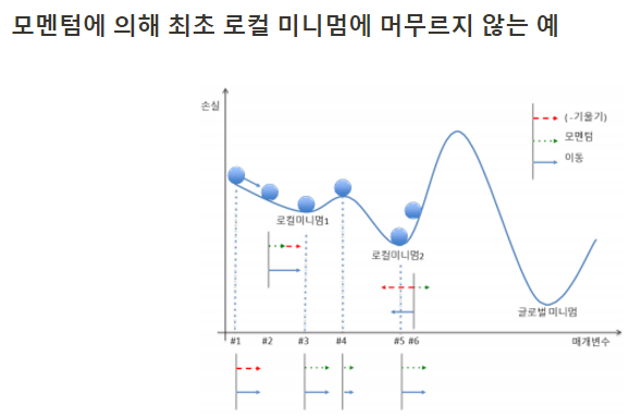 - 모멘텀 = 모멘텀 조정률 * 이동변수 딥러닝 최적화 방법