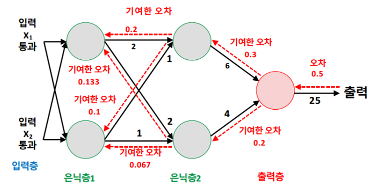 - 다시 뒤로 돌아가면서 각 기여도(공헌도)에 따라 오차를 분배해준다.