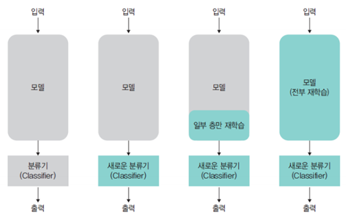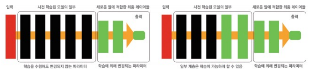 붙인 부분이 학습을 통해 파라미터가 변경되는 영역으로 만들면 되며 물론 그림 오른쪽과 같이 사전 학습된 모델의 일부를 학습 가능하게 만들 수 있음
