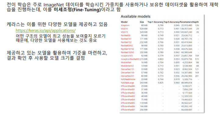사전학습(pre_trained) 모델의 검증된 아키텍처와 가중치를 그대로 가져오고 일부 새로운 층을 추가하거나 가중치를 조정하는 방식으로 학습하는 것을 전이 학습이라고 한다.