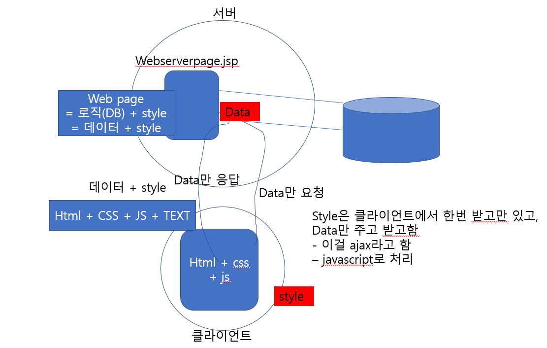 - 서버 수행 : java 코드만 서버에서 먼저 수행(요청 정보 파악, 데이터에 접속) (서버 프로그래머)