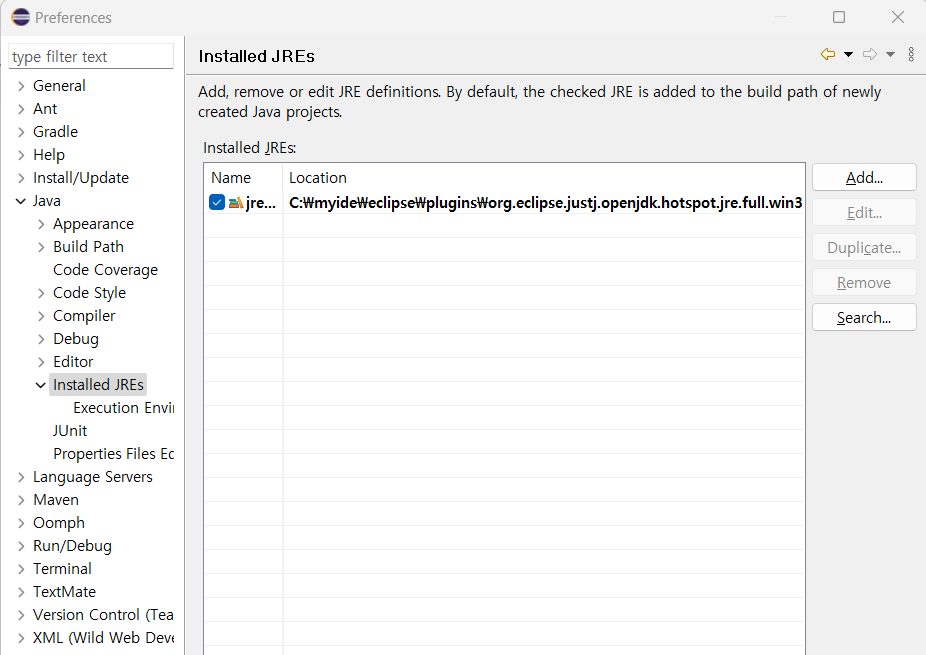 - Eclipse에서 Window, preferenes - Java 탭 - Installed JREs
