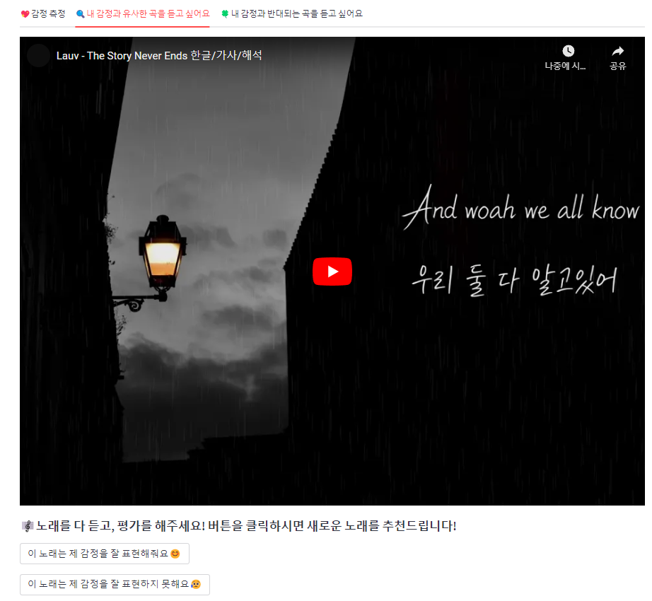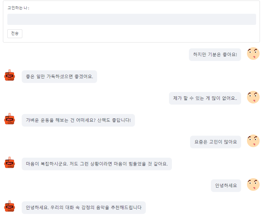 - 챗봇을 통해 AI와 공감 형태의 대화를 진행하고, 그 속에서 추출된 감성분석을 통해 감성과 유사한/감성과 반대의 음악을 추천해주는 웹사이트를 제작하였습니다.