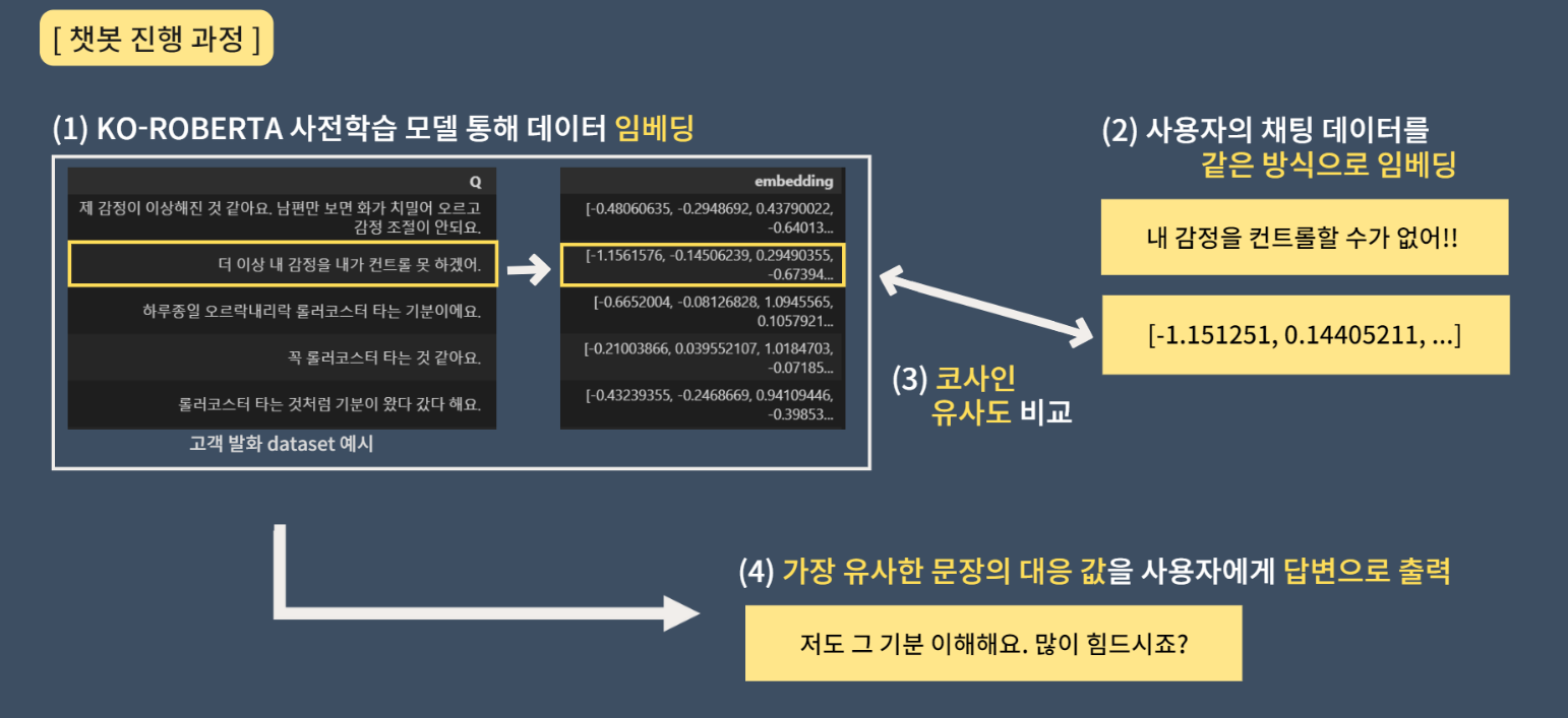 - 심리 상담에 가장 걸맞고, 사용자의 대화에 가장 자연스럽게 응답하는 방식을 짧은 시간 내에 구현하기 위해 사전학습모델과, 코사인유사도, DB 선택법을 활용하여 챗봇을 구현하였습니다.