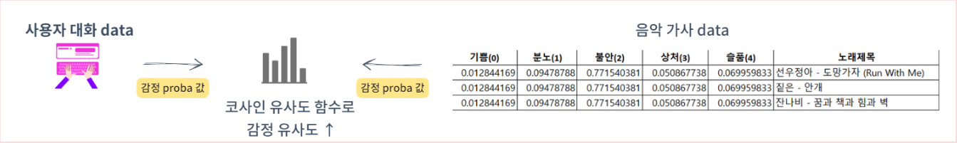 - 사용자의 텍스트 감정분석 데이터와 음악 가사 데이터의 감정분석 데이터를 활용하여 추천을 진행합니다.