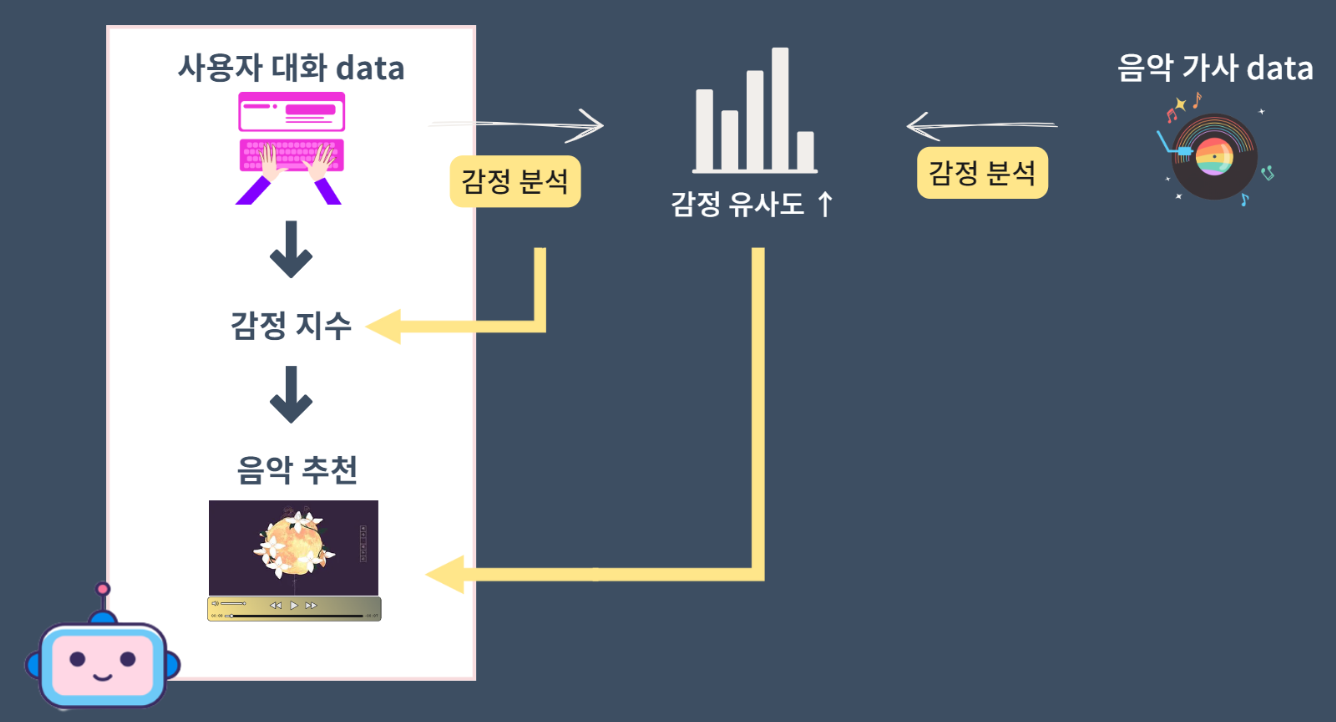 챗봇을 통해 분석된 사용자의 감성분석 데이터와, 음악 가사를 통해 분석된 감성분석 데이터의 감정 유사도를 통해 감정과 유사한 혹은 반대된 음악을 추천합니다.