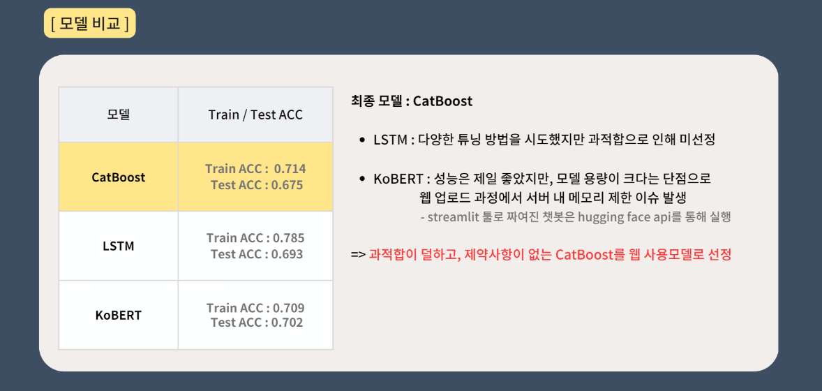 저희가 만든 딥러닝 모델이, CATBOOST에 비해 과적합 및 TEST 정확도 면에서 상당히 부족했습니다. 이는 전처리 방식을 바꾸면서, 또는 토크나이저를 바꾸면서도 진행해봤습니다만, 항상 CATBOOST 모델이 더 나은 모습을 보여줬습니다. 따라서 딥러닝 프로젝트 임에도 불구하고 CATBOOST 모델을 사용했습니다. 하지만 프로젝트 막판에 KOBERT를 사용해서 학습한 모델이 기존 모델들을 제쳤습니다. 이 모델은 가지고는 있으나, 메모리 문제로 인해서 웹에는 적용하지 않았습니다. - 노래의 감성을 어떻게 뽑을까..?