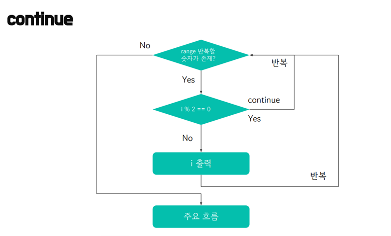 continue는 제어흐름을 유지하고, 반복문 안에서 특정조건에 부합할 때 해당 반복 회차만 빠져나가기 위해 씁니다. 그래서 continue문은 if 문과 함께 쓰이는게 보통입니다.