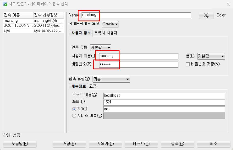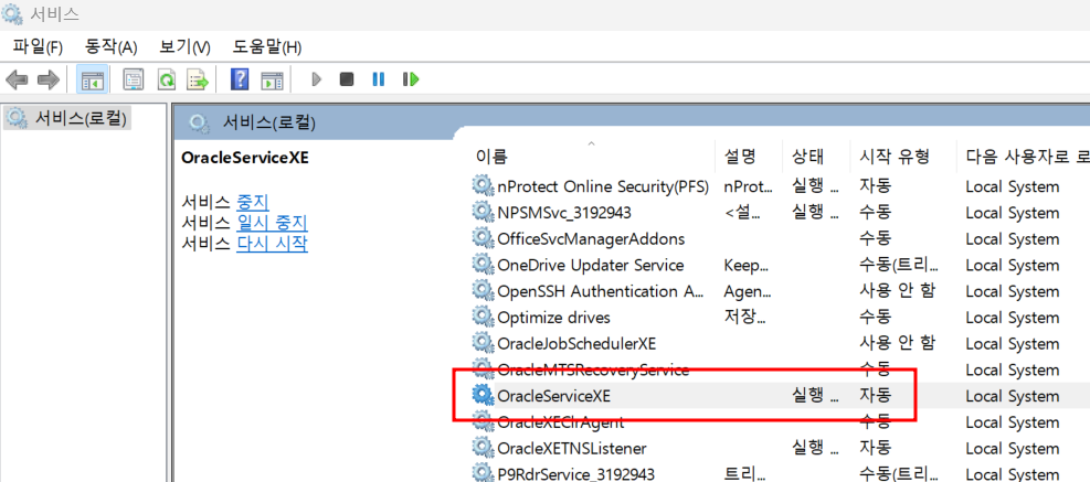- 윈도우 기준 -> 시작메뉴 -> 서비스 접속 -> OracleServiceXE 상태 확인