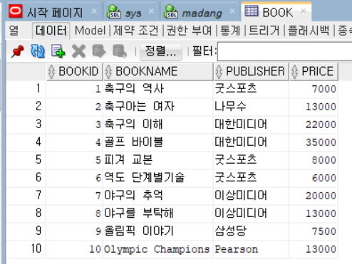 INSERT INTO Book VALUES(7, '야구의 추억', '이상미디어', 20000);