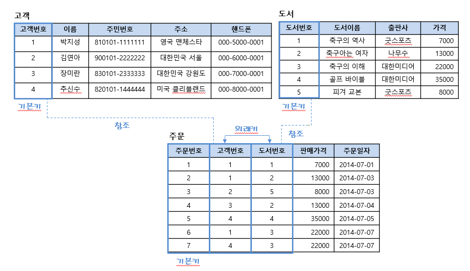 - 다른 릴레이션의 기본키를 참조하여 관계 데이터 모델의 특징인 릴레이션 간의 관계를 표현함.