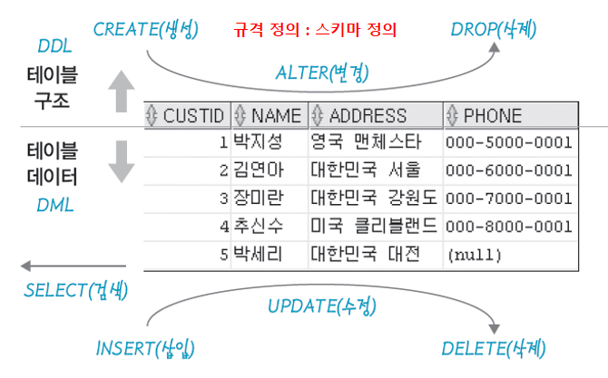 테이블이나 관계의 구조를 생성하는데 사용하며 CREATE, ALTER, DROP 문 등이 있음